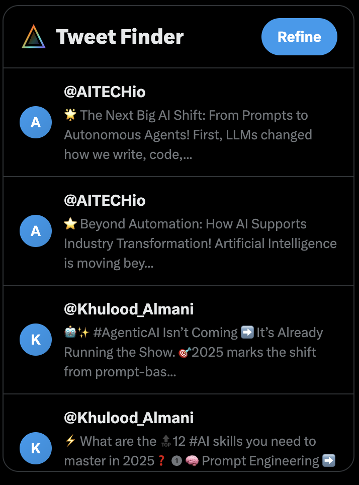Finding high‑quality tweets is now simpler and more effective. The Tweet Finder and Discover views show full tweet content, real engagement signals, and media previews — so you can decide what to use at a glance.