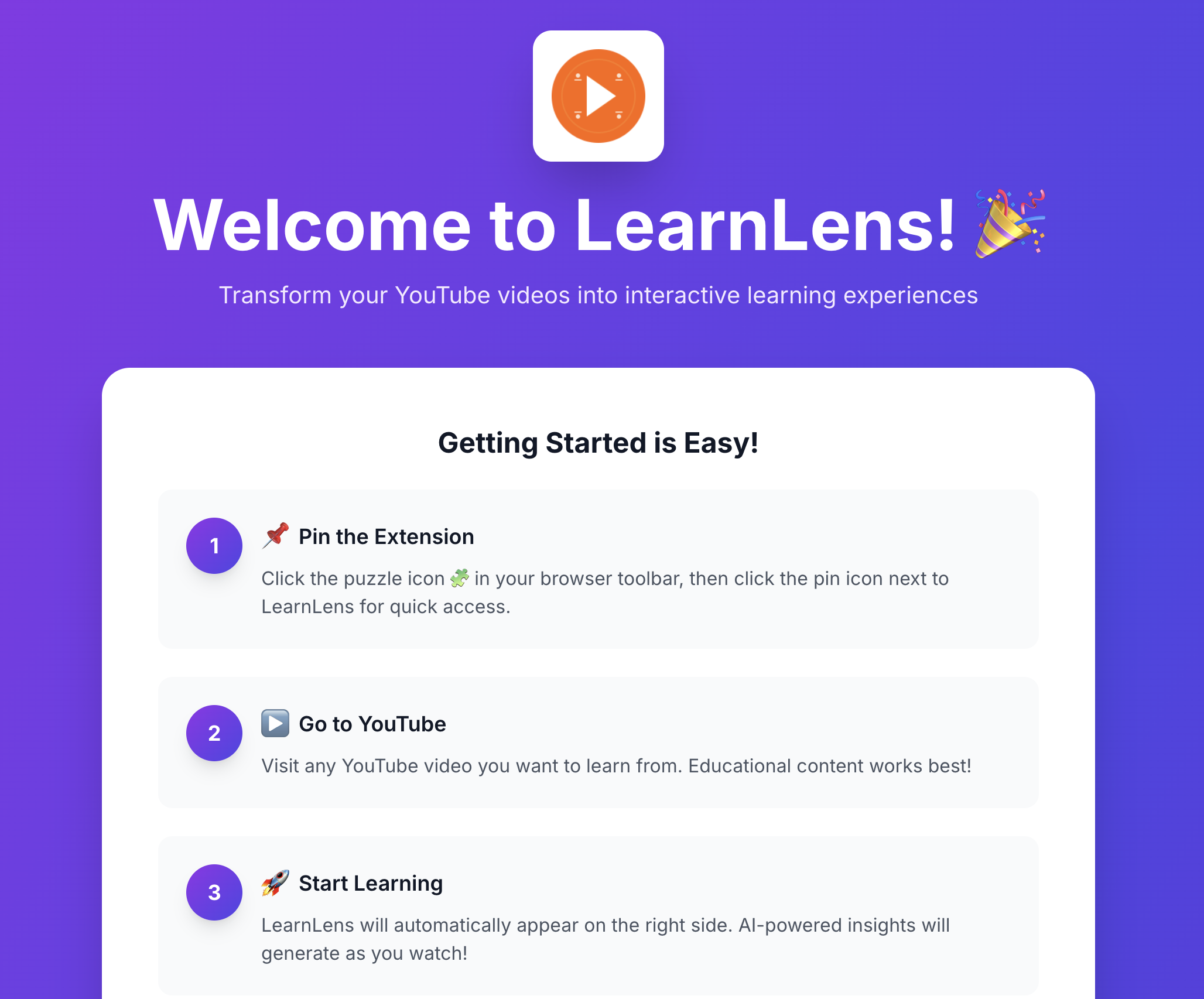 🎓 Welcome to Effortless Learning: New to LearnLens? You’ll now see a beautiful onboarding experience with step-by-step setup and a curated collection of popular educational videos across AI, business, science, and psychology. Try LearnLens immediately with quick-start videos—no hunting for content, just instant learning.